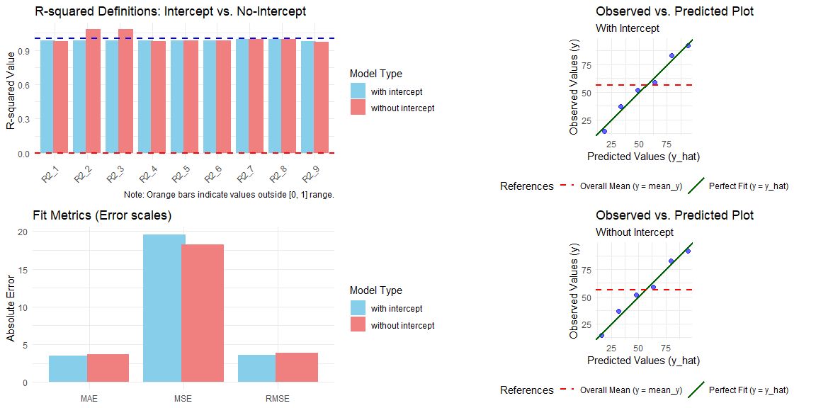 - R-squared Comparison (Top-Left): Side-by-side bars for all 9 definitions. Orange bars instantly flag “illegal” values (e.g., \(R^2 > 1\) or \(R^2 < 0\)), which are common in no-intercept models.