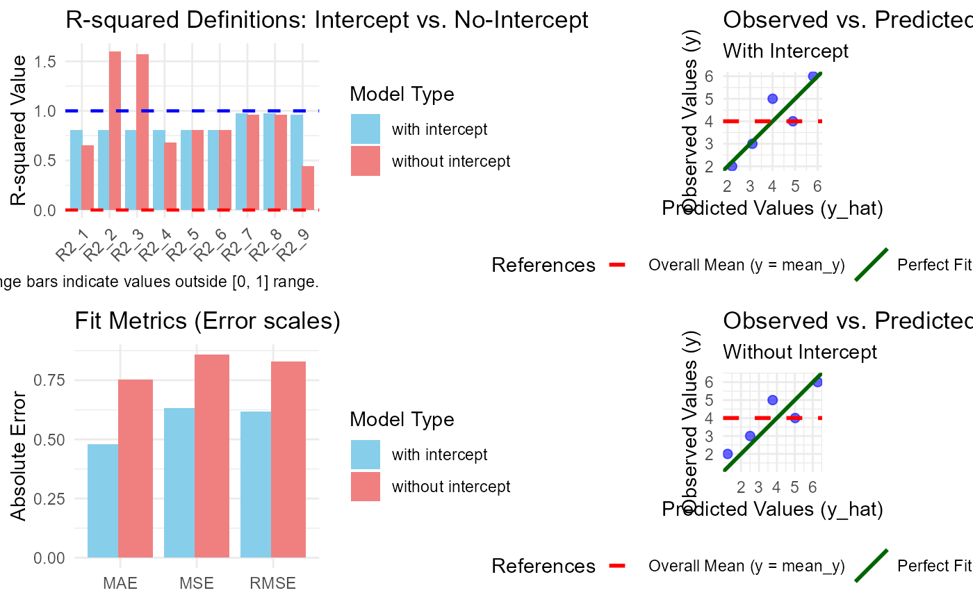 Generates a comprehensive 2x2 diagnostic dashboard comparing models with and without an intercept. This visualization helps identify how the absence of an intercept affects different R-squared definitions and error metrics.